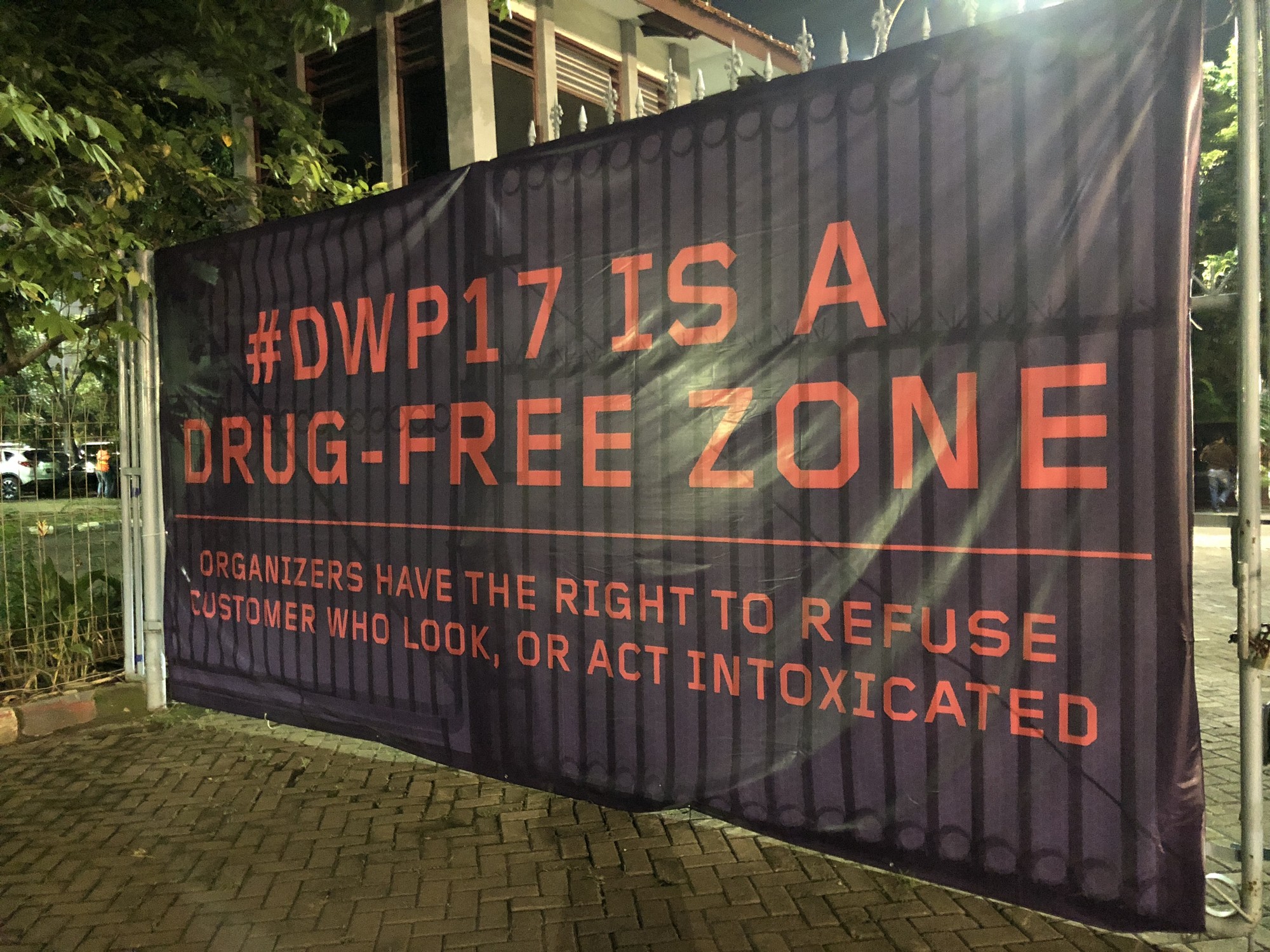 Left: Numerous “Anti-Drug” signs appear throughout the festival, which do not appear especially ominous given Indonesia’s strict death penalty for drug traffickers and life imprisonment for possession.