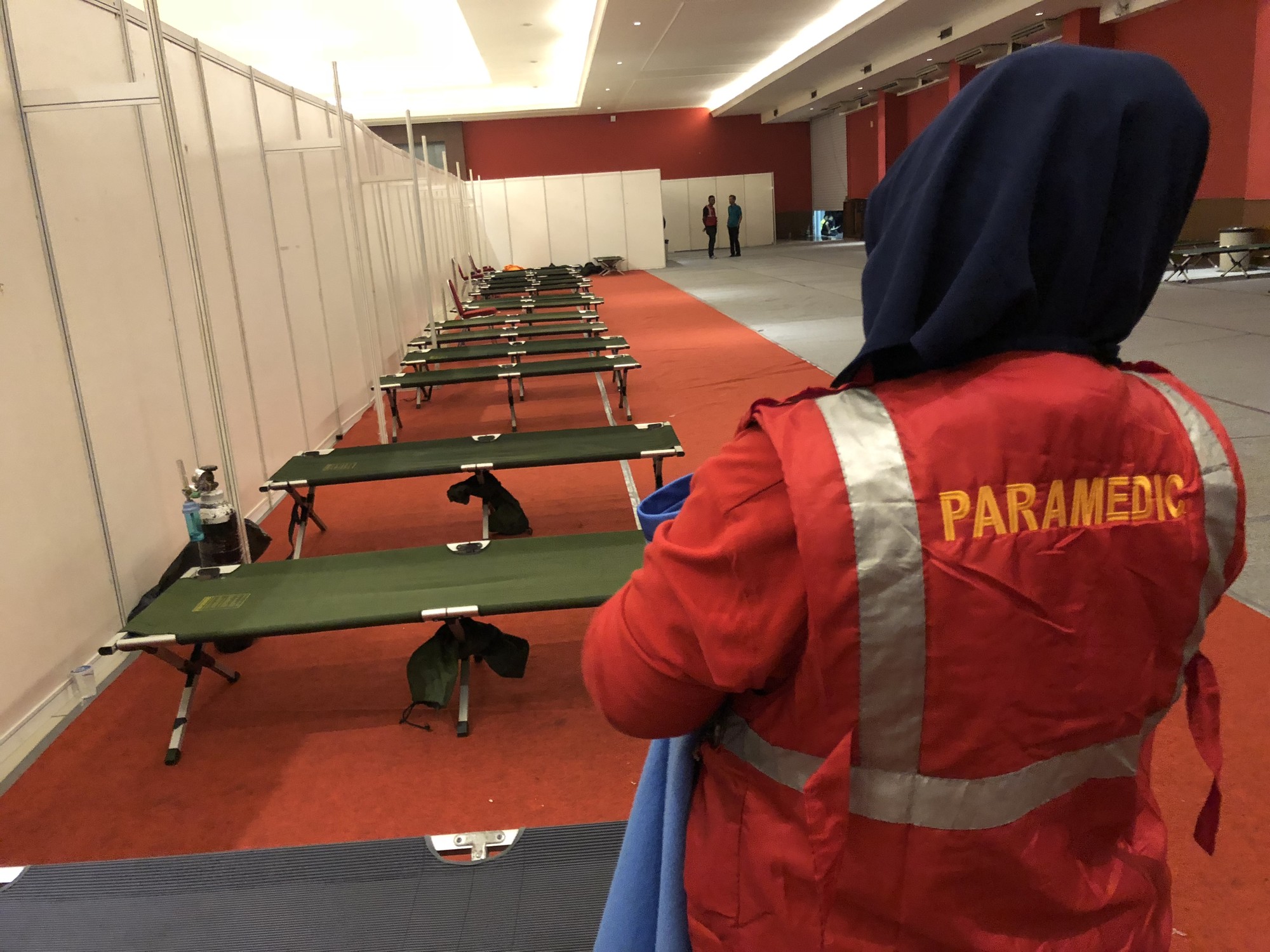 Right: As the night begins, a Paramedic wearing a hijab stands watch over “Main Medical” which is a fixed structure with adequate lighting, staffing and cots.